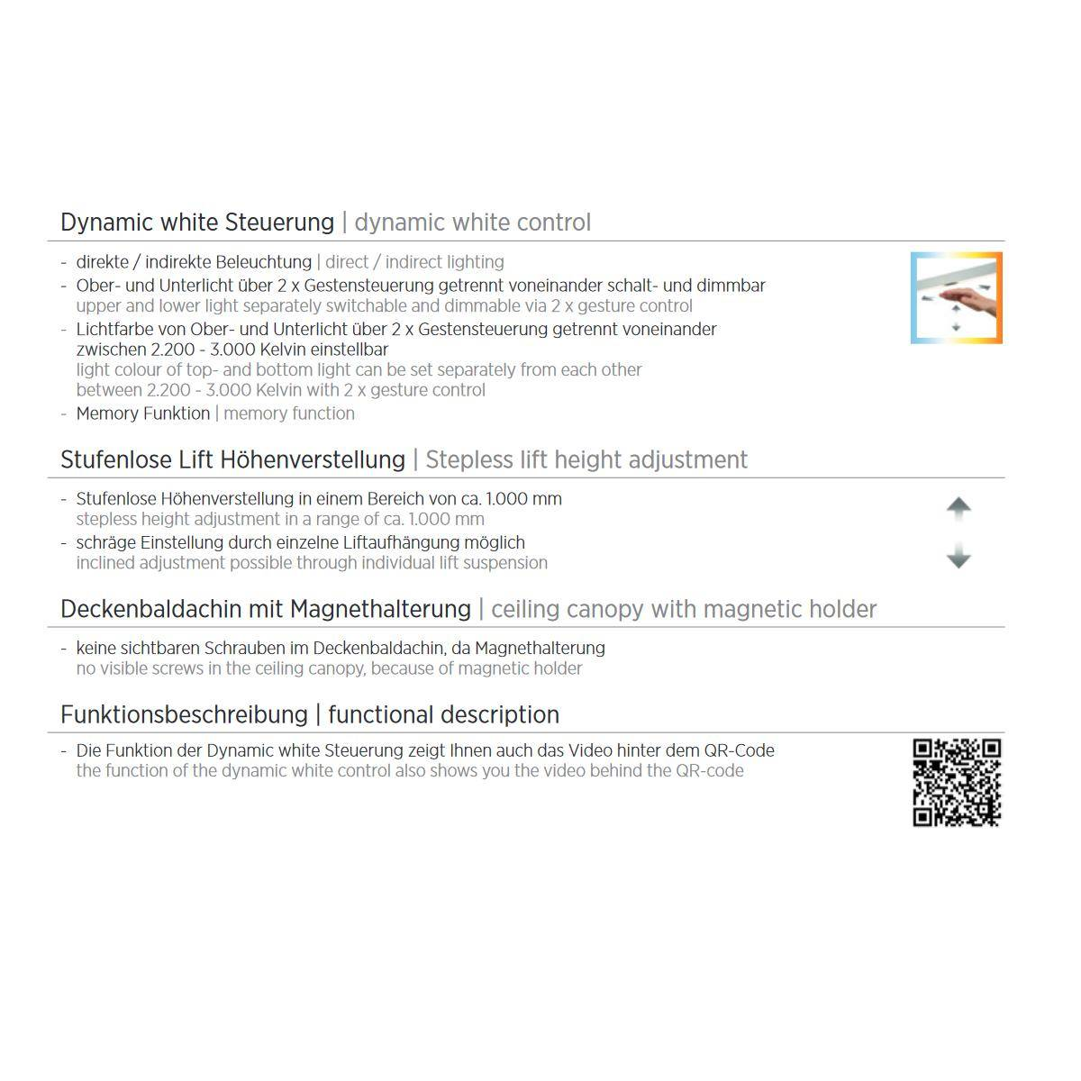 Stufenlos höhenverstellbare LED-Pendelleuchte Runa (Dim-to-warm) von Knapstein passt sich mit der stufenlosen Höhenverstellung dem Wunsch der Kunden individuell an. Durch direkte Beleuchtung nach unten und indirekter Beleuchtung nach oben sorgt die Leuchte gleichzeitig für Raumlicht und gemütliches Licht beim Abendessen. Mit Gestensteuerung lässt sich das Ober- und Unterlicht getrennt voneinander schalten und dimmen und ist einstellbar über Gestensteuerung zwischen 2200 Kelvin bis 3000 Kelvin. Runa verfügt über eine Memory-Funktion: Die Leuchte merkt sich beim erneuten Anschalten die zuletzt genutzte Einstellung.