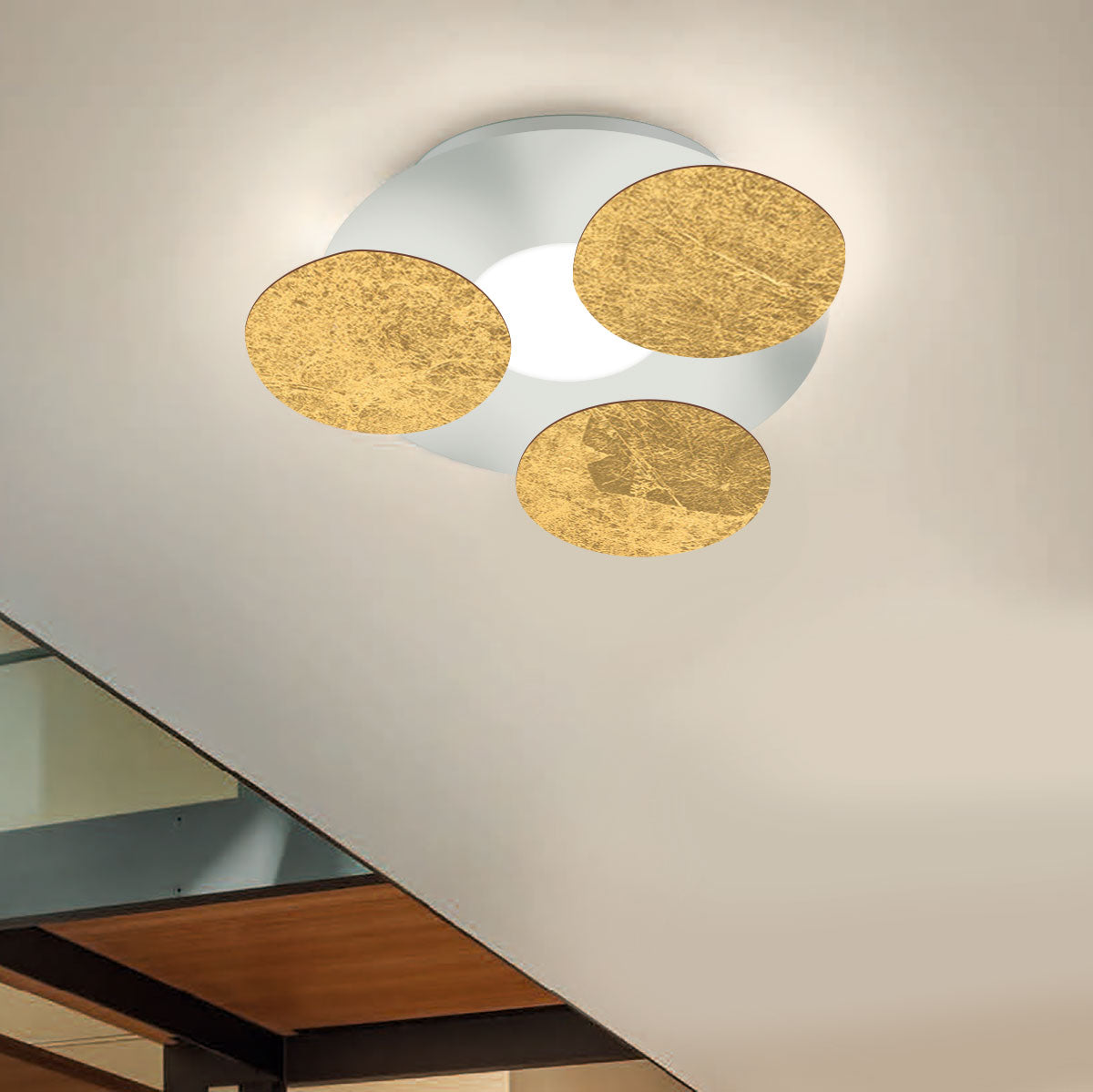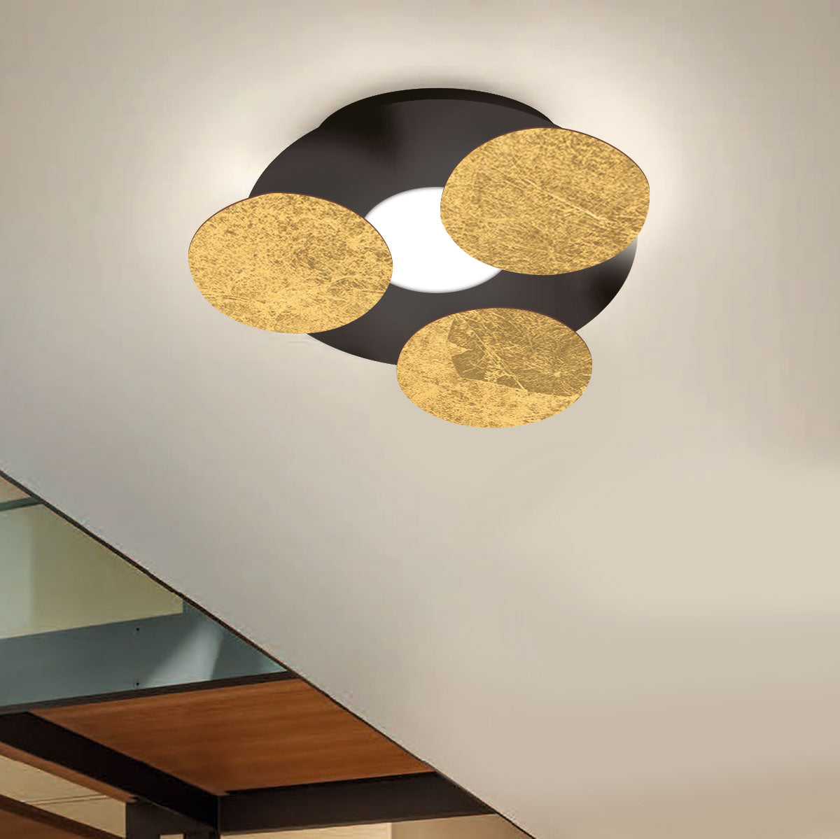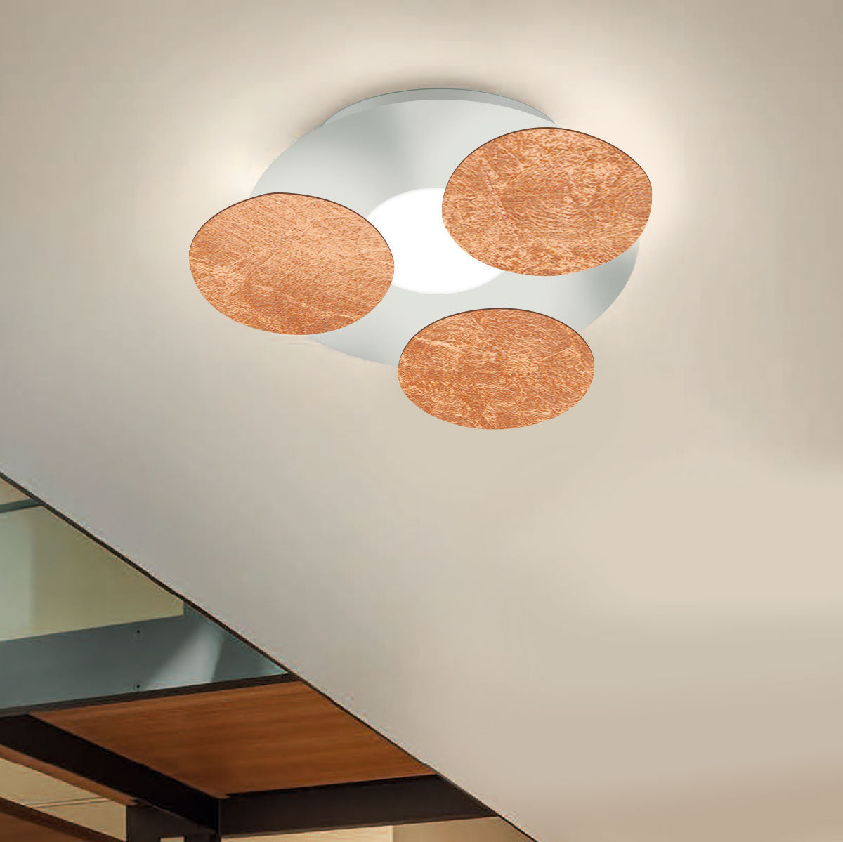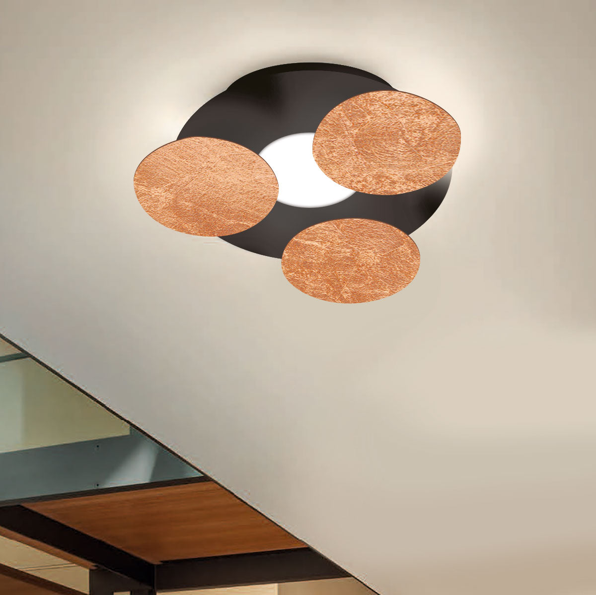 Farben: Außenfarbe: weiß, schwarz; Innenfarbe: weiß, dunkles rost, taupe, blattgold, blattsilber, blattkupfer; Höhe: 11cm; Durchmesser: 35cm; Farbtemperatur: 2700 Kelvin; 17 Watt; 1450 Lumen; Energieeffizienzklasse: G