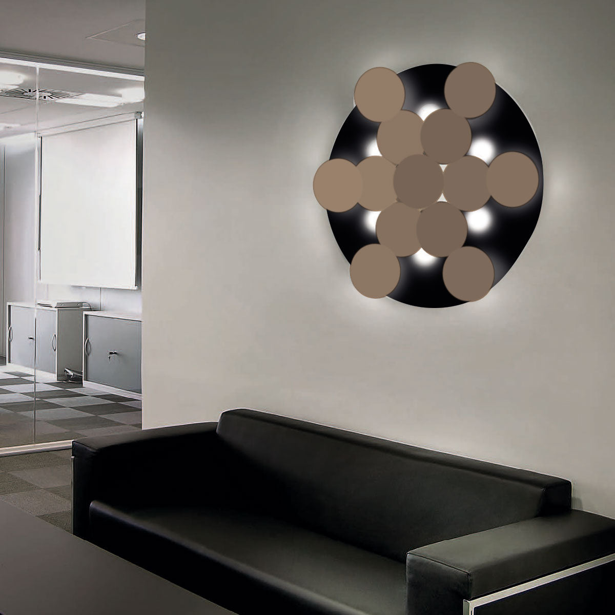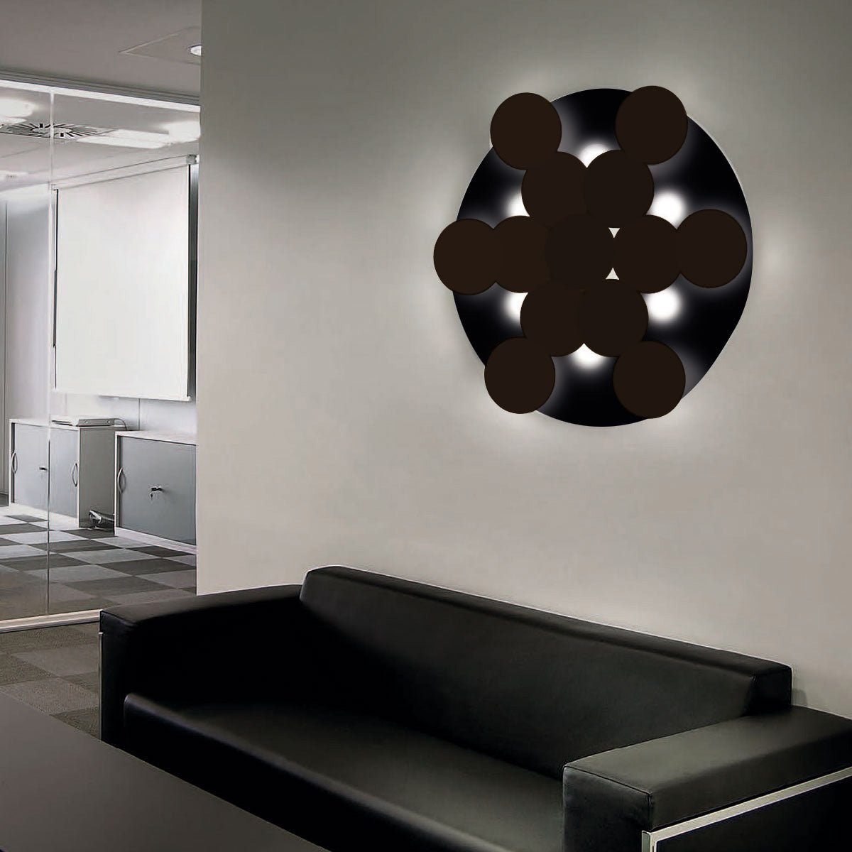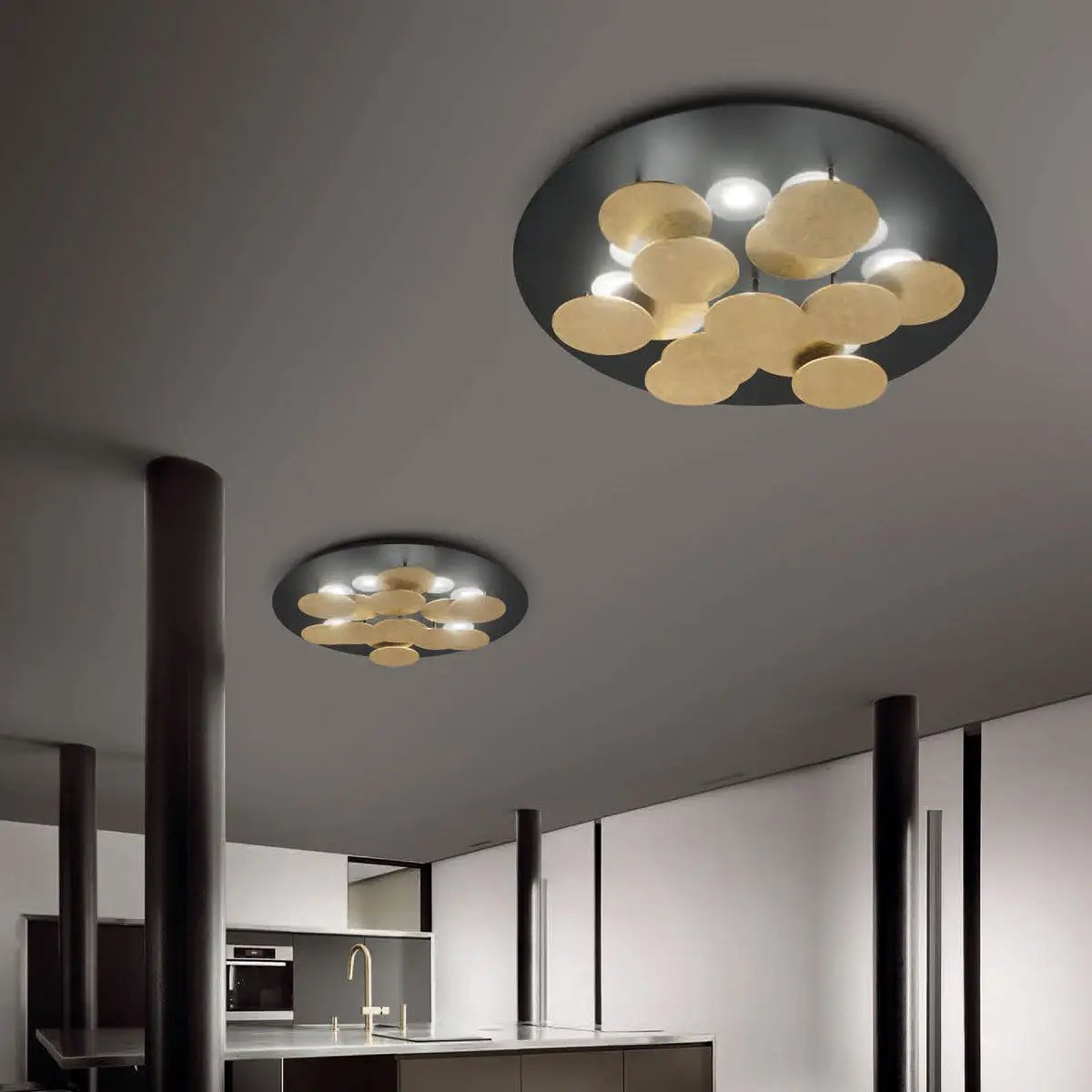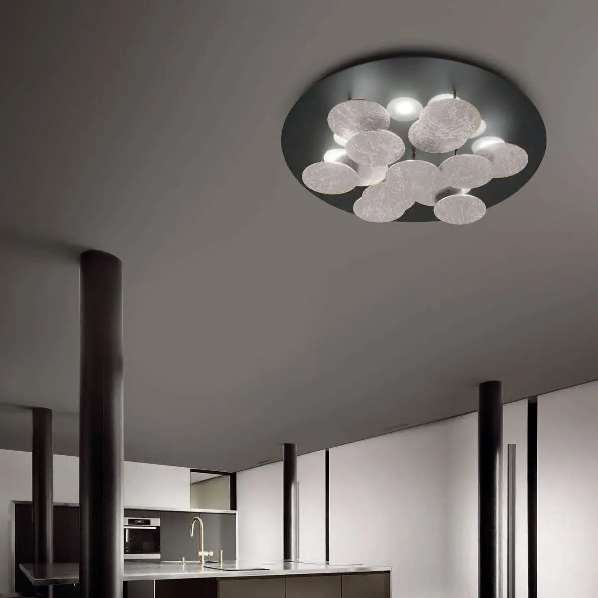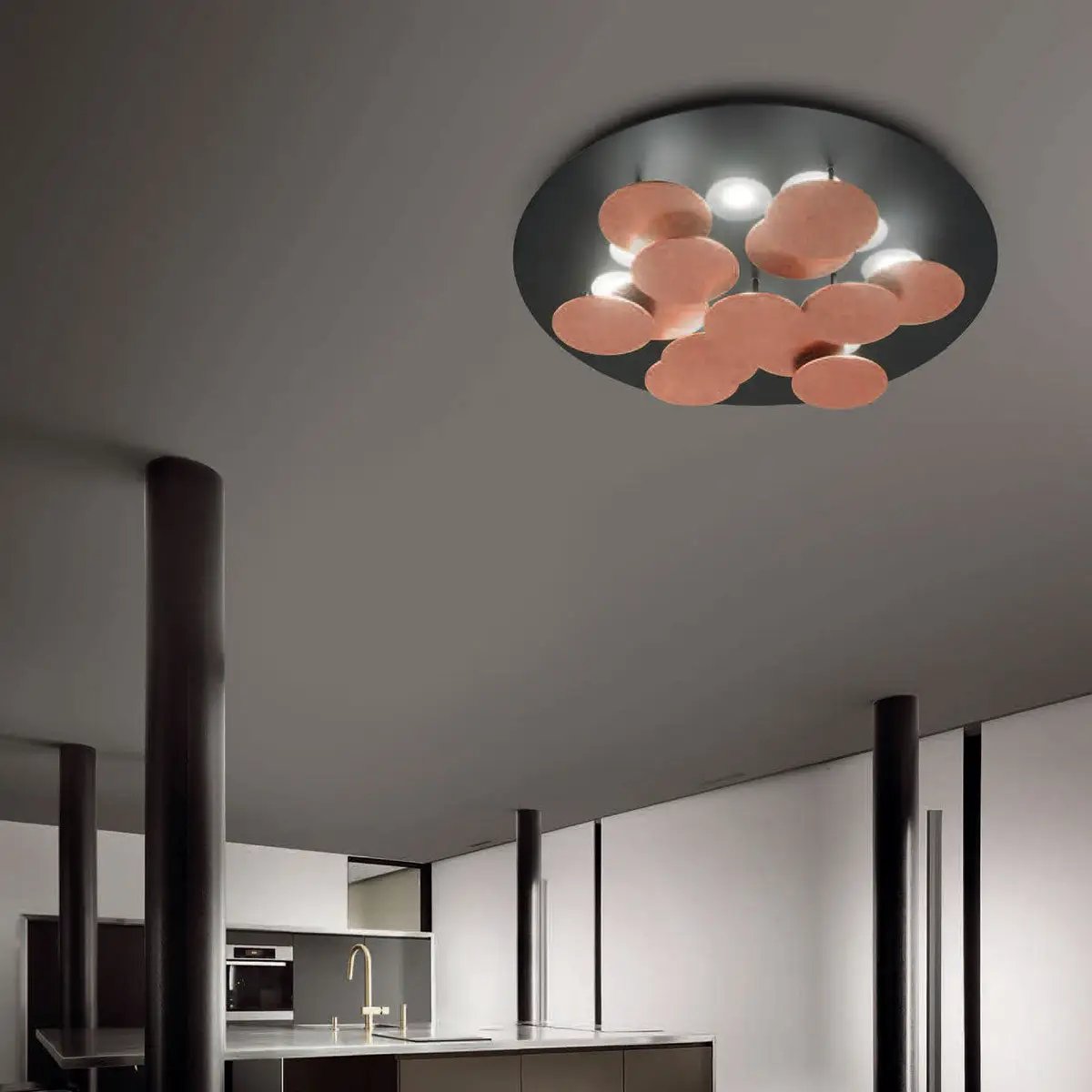 Die Deckenleuchte Nuvola von Braga besticht durch ihre weiche, harmonische Formgebung und futuristisch-minimalistische Linienführung. Dreizehn runde Elemente unter dem Baldachin dienen nicht nur als beeindruckende Designelemente, sondern werfen auch einen Teil des Lichts nach oben zurück. Dies schafft eine wundervolle Mischung aus direktem und indirektem Licht, die angenehm hell und entspannend wirkt. Nuvola  ist in den verschiedensten Farben erhältlich und somit eine exklusive Wahl für jeden Raum.