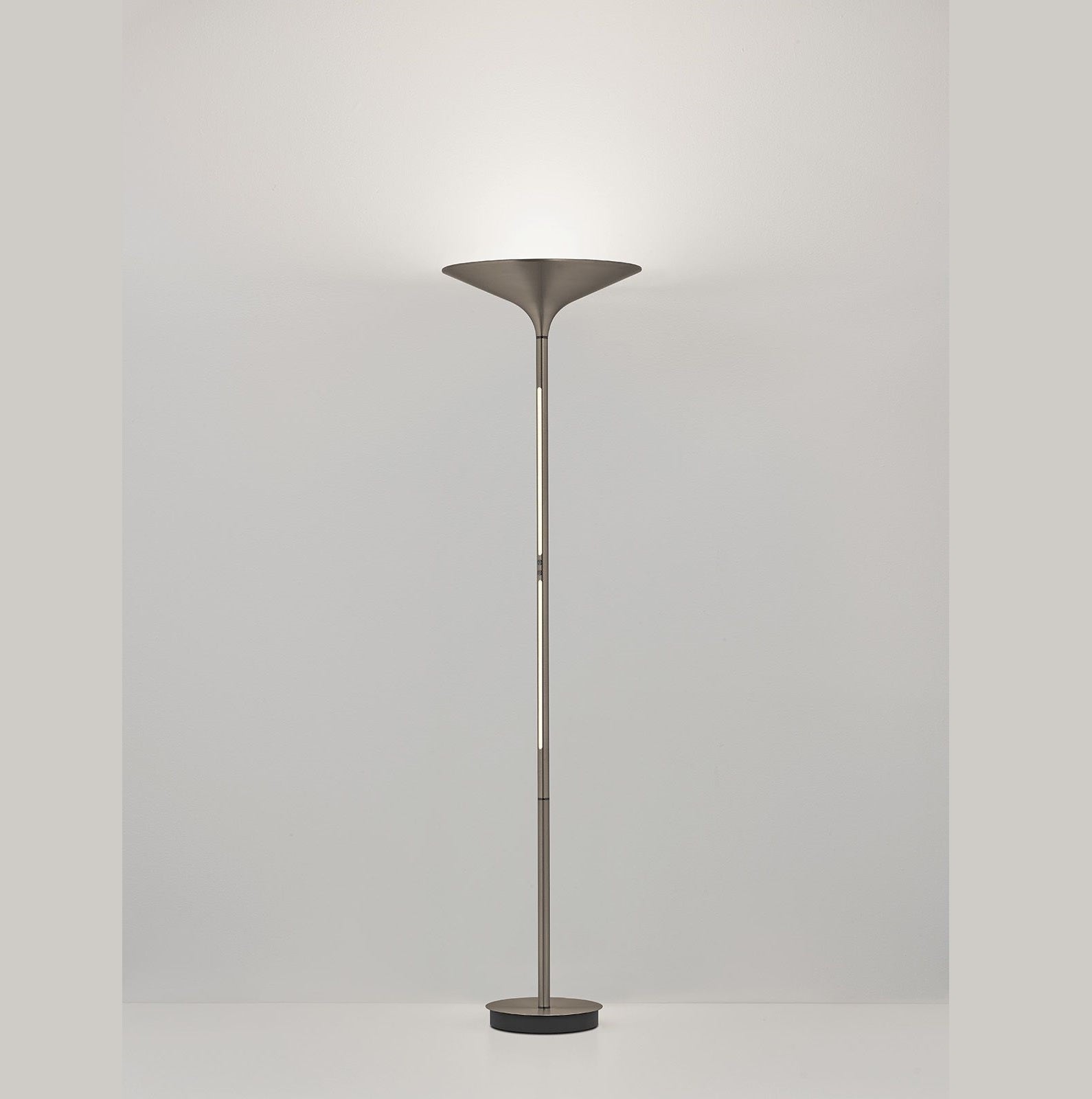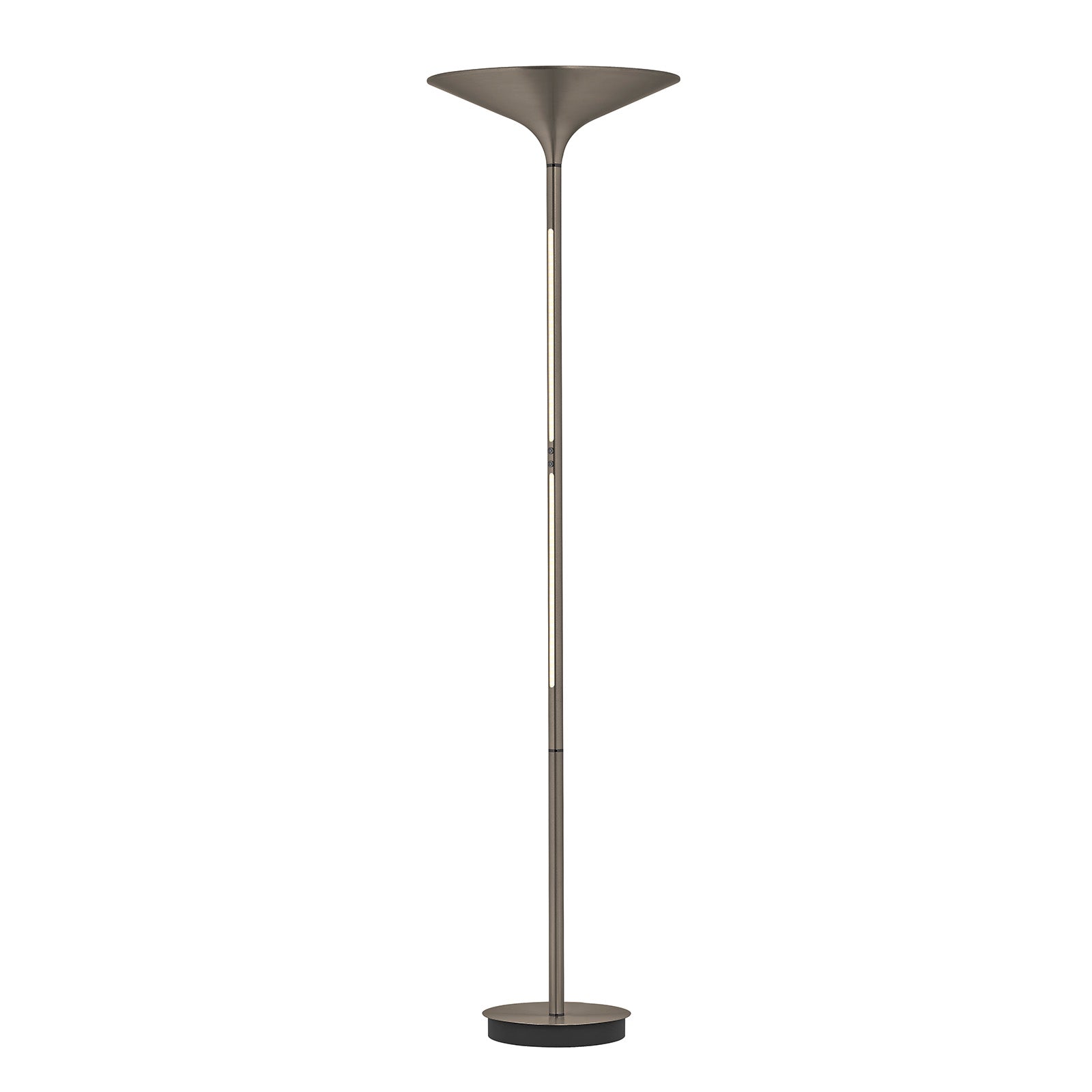 Die Stehleuchte Klaas in elegantem Bronze / Aluminium verbindet stilvolles Design mit moderner Lichttechnik. Als moderner Deckenfluter mit zwei separat steuerbaren Lichtquellen durch den Tastdimmer sorgt sie für individuell anpassbares Licht – ganz nach deinem Bedarf und deiner Stimmung. Mit der stufenlos einstellbaren Lichtfarbe von warmweiß bis tageslichtweiß passt sie sich jeder Situation an. Die nach oben gerichtete Hauptlichtquelle sorgt für eine angenehme, indirekte Raumbeleuchtung, während die zweite Lichtquelle ideal als Lese- oder Akzentlicht dient. Beide Lichtquellen lassen sich unabhängig voneinander steuern, sodass du Lichtzonen gezielt setzen und dein Zuhause optimal ausleuchten kannst.
