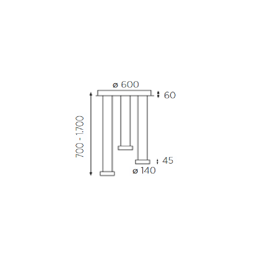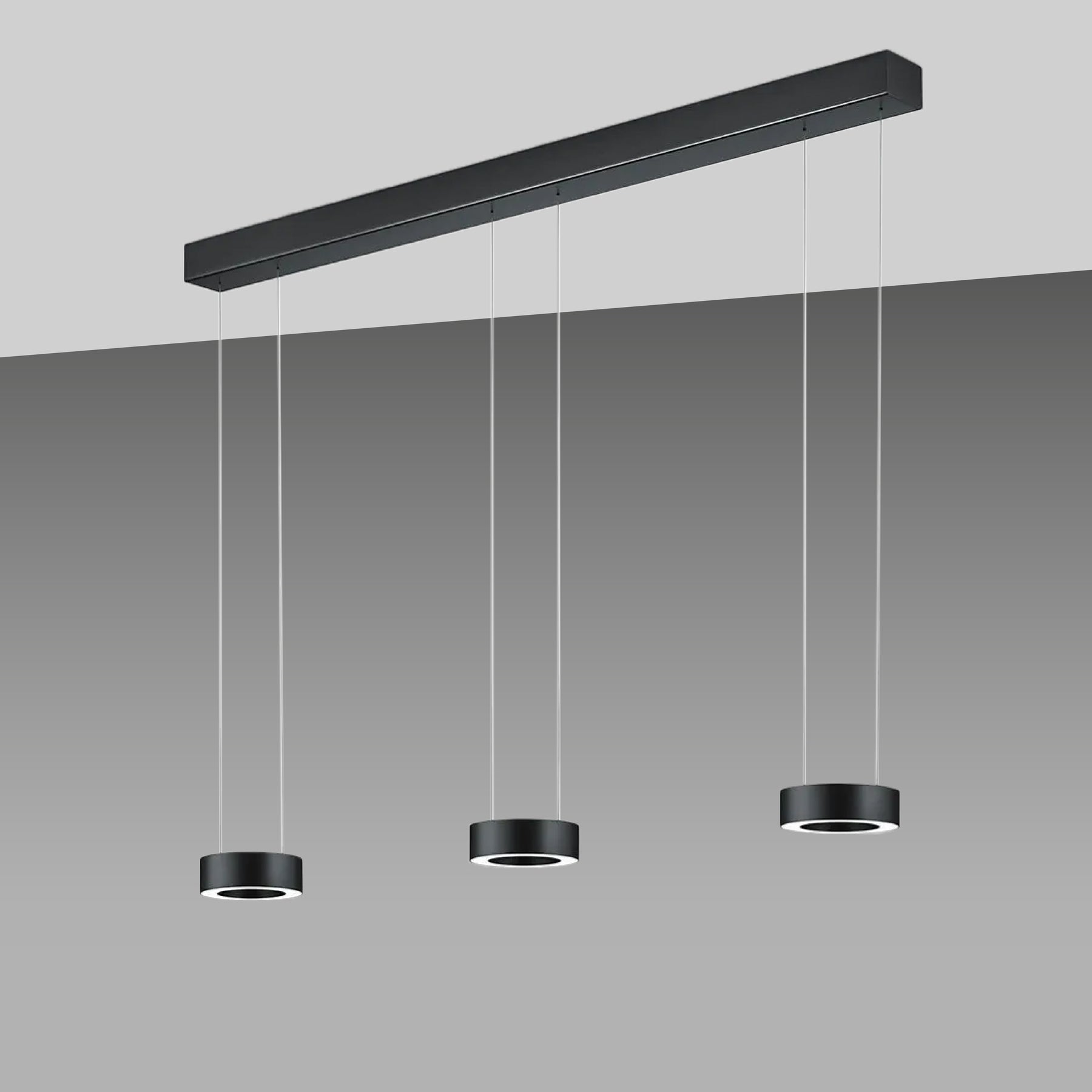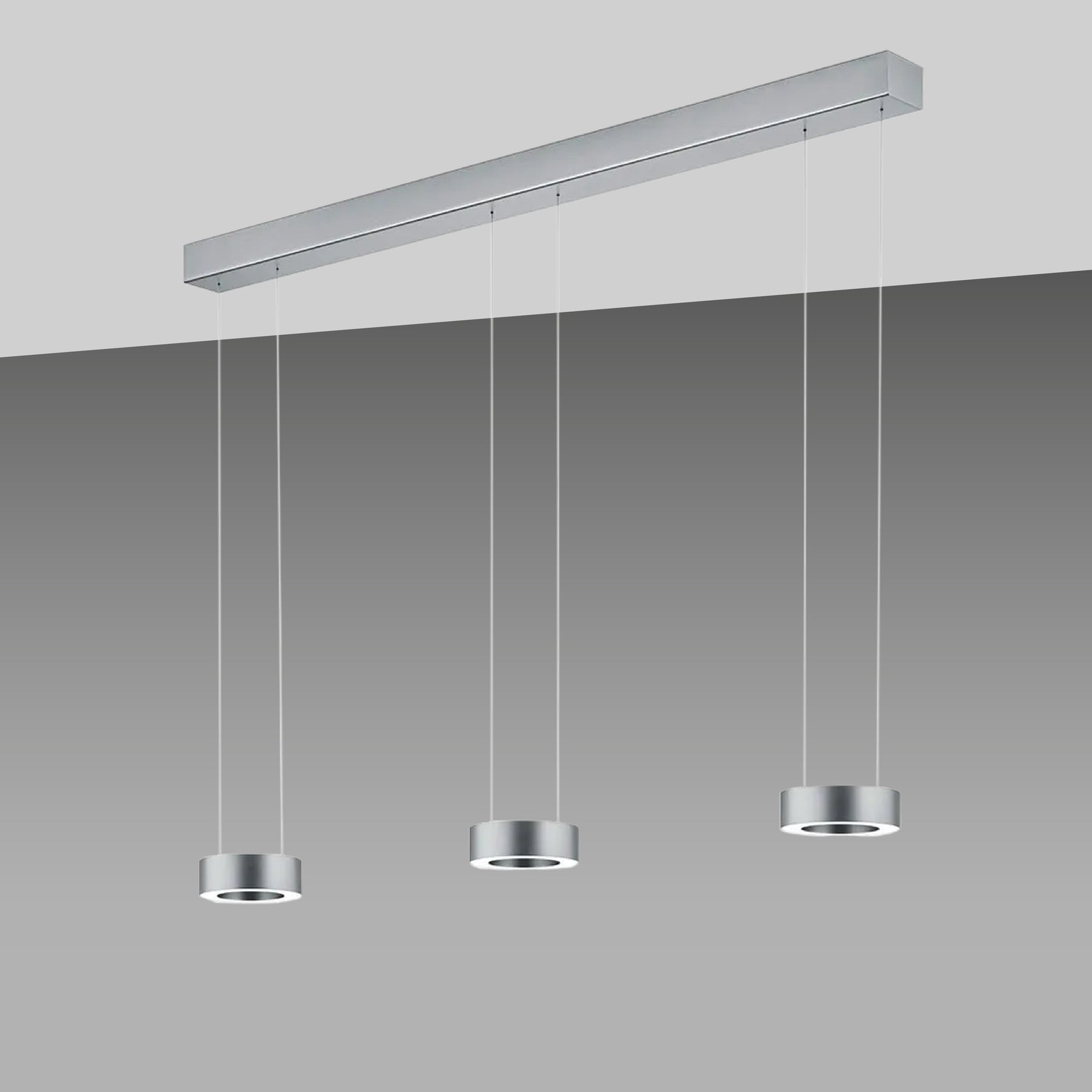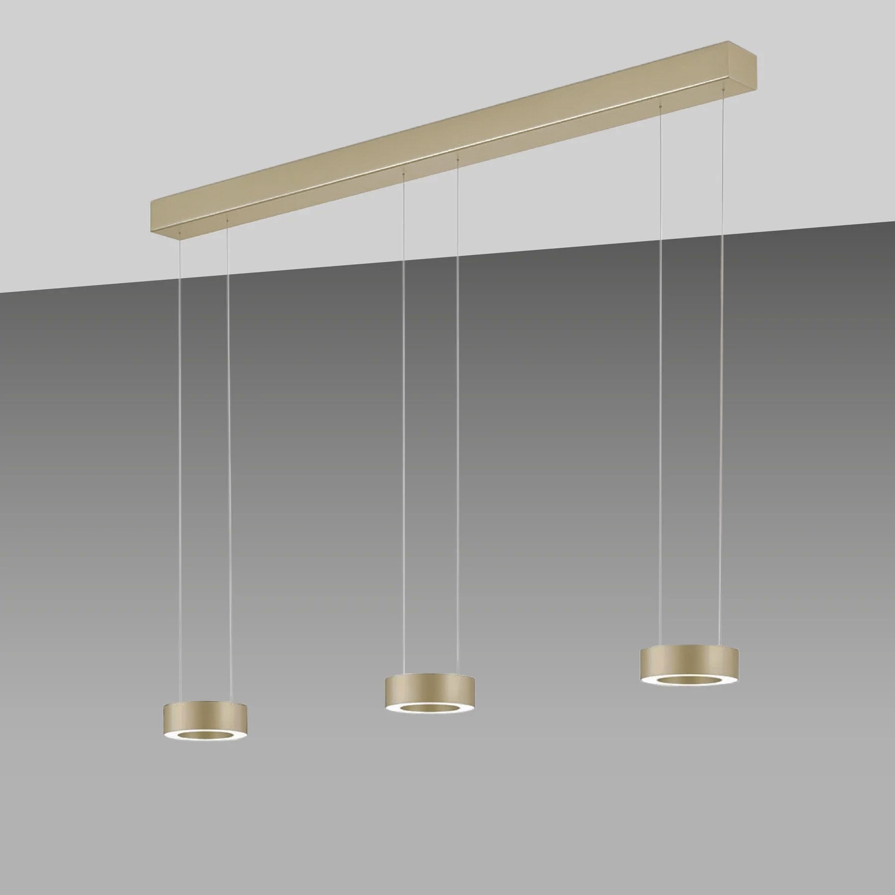 Version 3-flammig: Länge: 120cm, Ring Ø 14cm, Höhe Ring: 4,5cm, Höhe: verstellbar 70-170cm, Baldachin: Ø 5,5cm, Leistung: 6x 12W, Lumen: 7644, Farbtemperatur: 2200 - 3000K, Dimmbar: ja, über Gestensteuerung, Schutzart: IP20, Energieeffizienzklasse: F