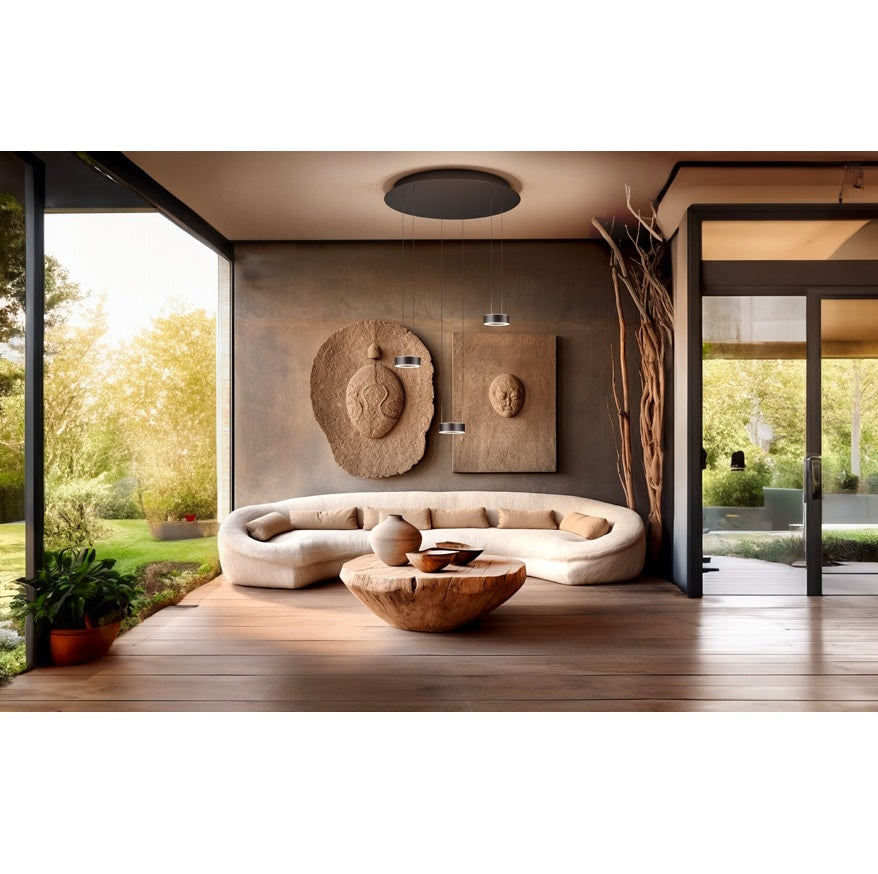 Version 3-flammig Rund: Ring Ø 14cm, Höhe Ring: 4,5cm, Höhe: verstellbar 70-170cm, Baldachin: Ø 60cm, Leistung: 6x 12W, Lumen: 7644, Farbtemperatur: 2200 - 3000K, Dimmbar: ja, über Gestensteuerung, Schutzart: IP20, Energieeffizienzklasse: F