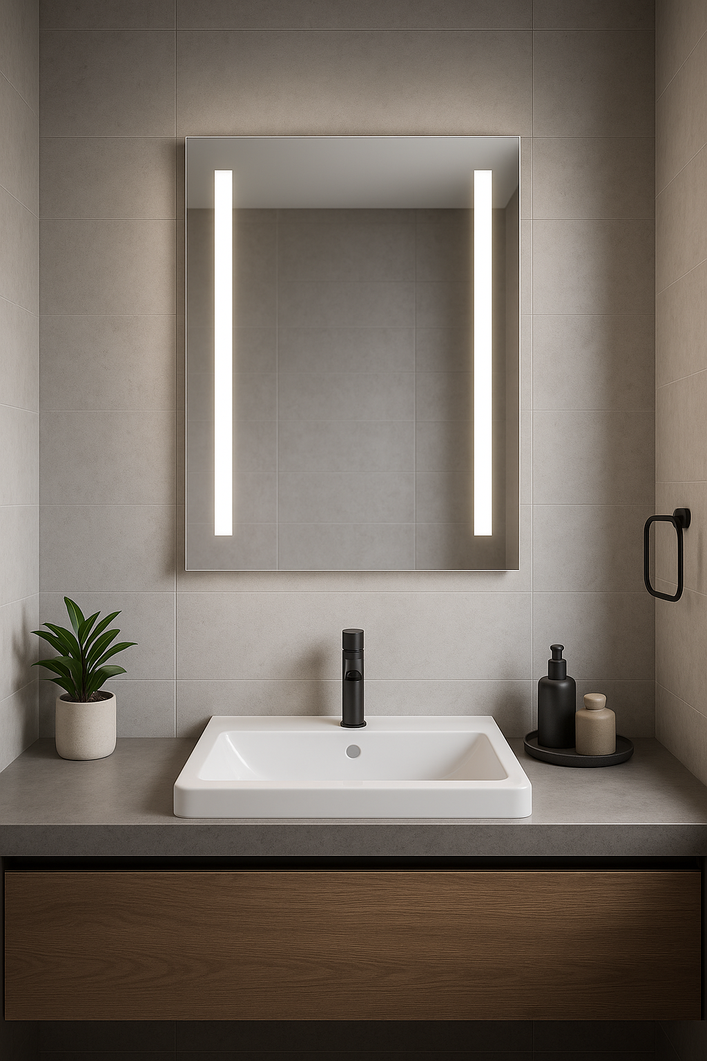 Der LED-Spiegel Senna vereint modernes Design mit perfekter Ausleuchtung. Mit seinen klaren Linien, dem schlanken Rahmen und der integrierten LED-Beleuchtung wird er zum Blickfang in jedem Raum – ob im Bad, im Flur oder im Ankleidezimmer. Über die integrierte Dip-Switch-Technologie lässt sich die Lichtfarbe direkt am Spiegel individuell anpassen.